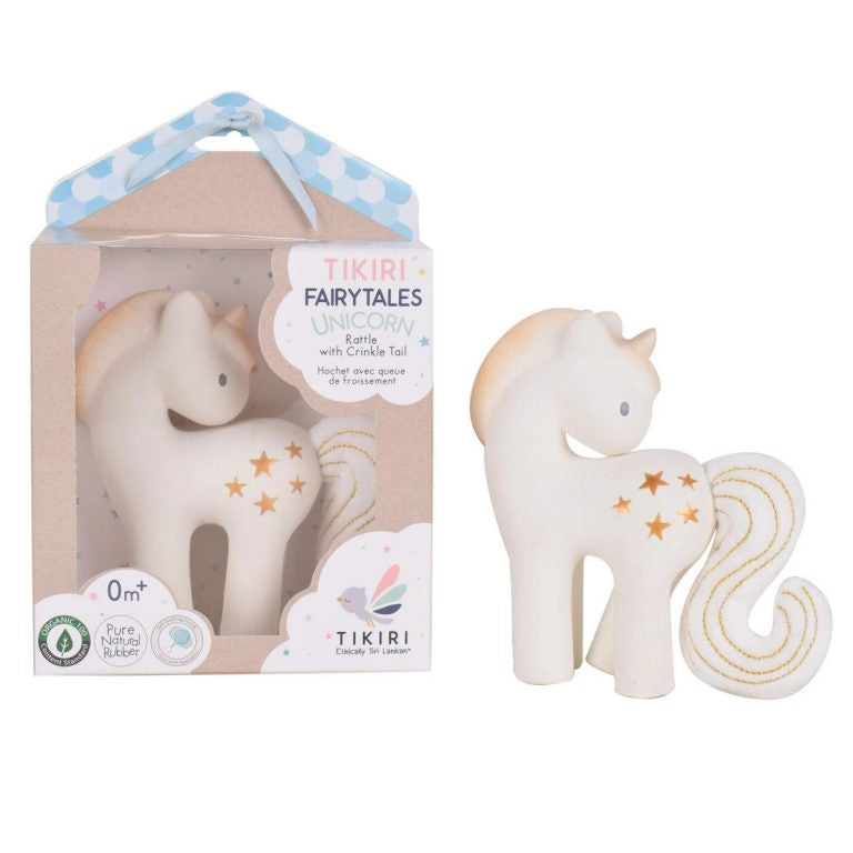 Shinig Stars Unicorn from our Tikiri Fairytales collection. Made from natural rubber and hand painted with soy-based ink, our Unicorn is a magical toy for little ones. Easy grip for smaller hands. the crinkle tail provides stimulation for babies.