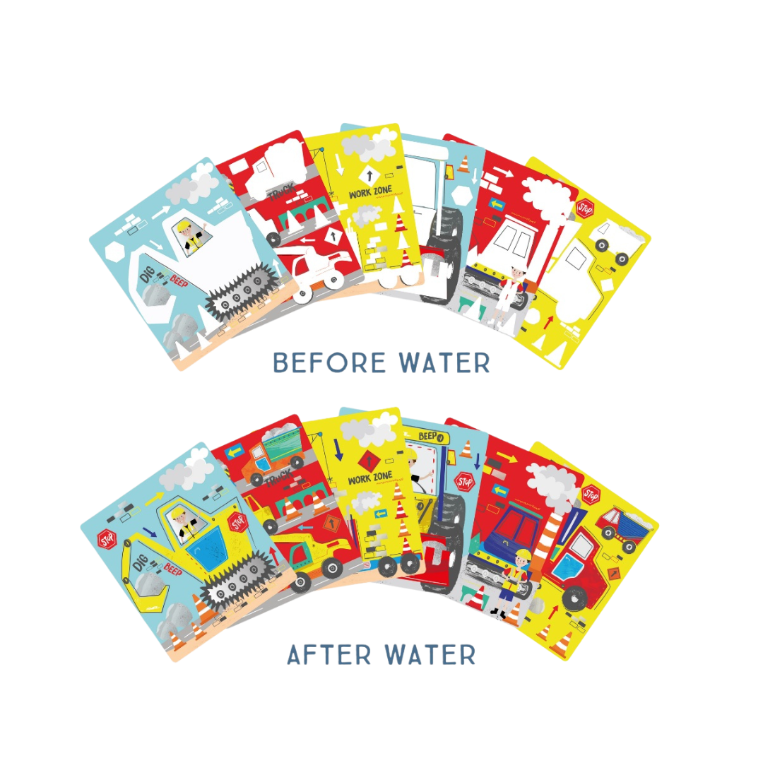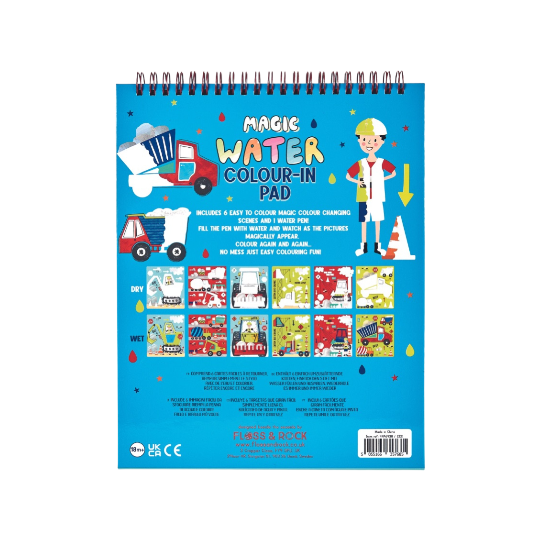 Our Magic Water Easel Pads are so much fun! Like our popular water cards, fill up the pen with water and colour in the designs to see them magically appear, then disappear once dry. The 6 brightly coloured fun sheets are held together in a spiral bound pad allowing you to flip them over once complete. The built-in easel stands the pad up so you can use it like a ‘proper’ artist! The pad is reusable over and over again and you’ll have so much fun revealing the colourful diggers, trucks, builders and more! Once you’ve finished your creative session, close the pad and secure your special water pen in the elastic closure to keep it nice and safe. This portable pad is perfect for taking out and about (and you don’t have to worry about any mess either!)