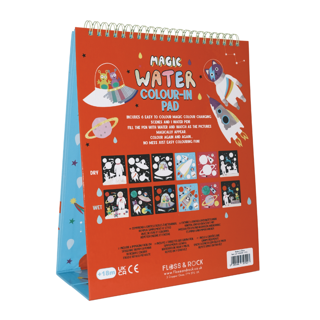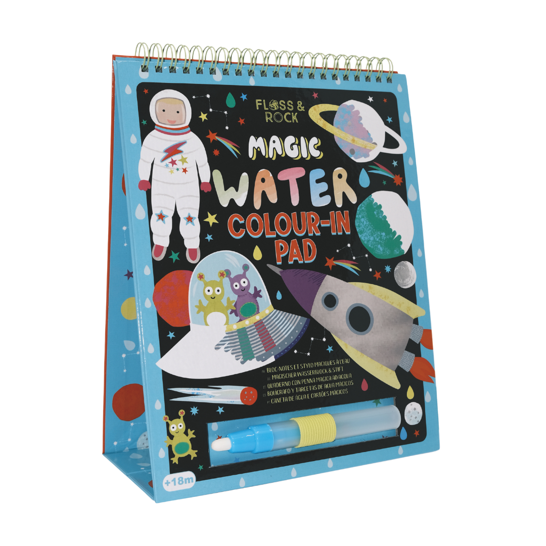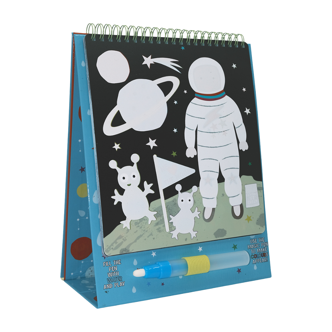 Our Magic Water Easel Pads are so much fun! Like our popular water cards, fill up the pen with water and colour in the designs to see them magically appear, then disappear once dry. The 6 brightly coloured fun sheets are held together in a spiral bound pad allowing you to flip them over once complete. The built-in easel stands the pad up so you can use it like a ‘proper’ artist! The pad is reusable over and over again and you’ll have so much fun revealing the colourful space people, aliens, planets, shooting stars and much more! Once you’ve finished your creative session, close the pad and secure your special water pen in the elastic closure to keep it nice and safe. This portable pad is perfect for taking out and about (and you don’t have to worry about any mess either!)